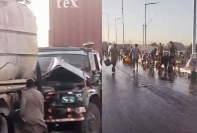 Karachi, A collision between a trailer and an oil tanker on the Kemari Native Jetty Bridge resulted in thousands of liters of oil worth millions of rupees spilling onto the road.